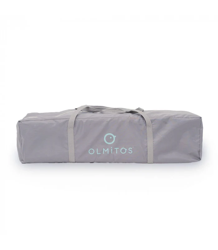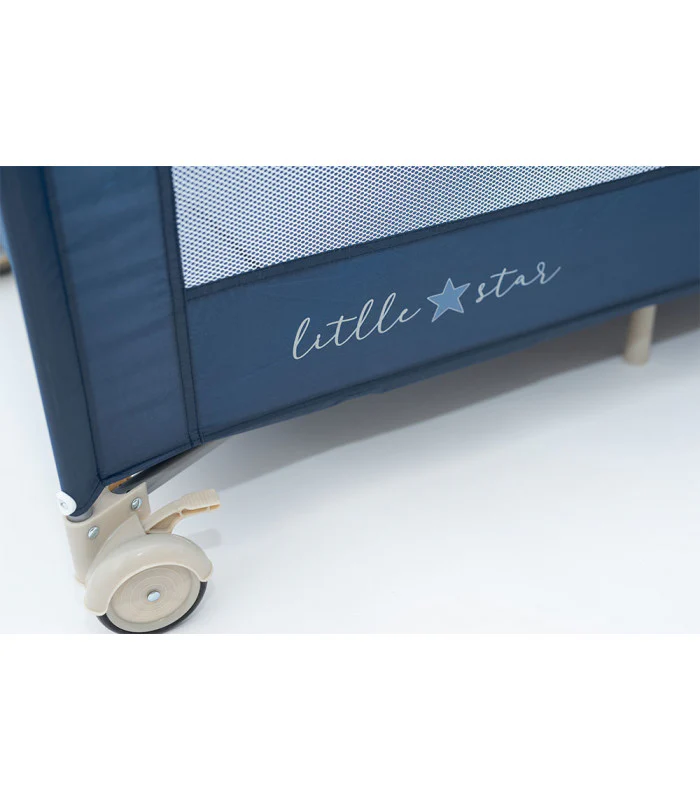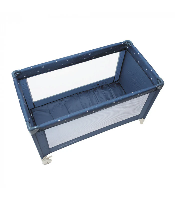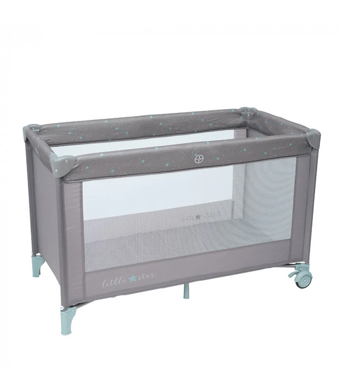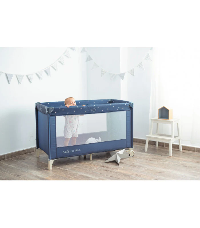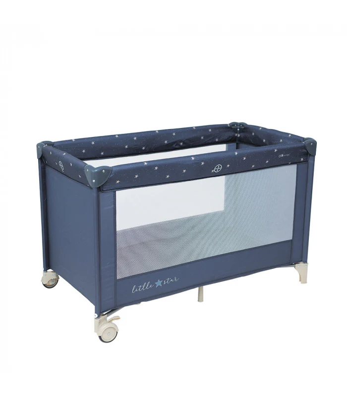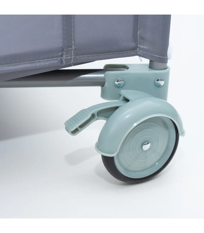 Cuna de viaje con ruedas para facilitar el movimiento y con frenos de seguridad. Sus paredes son de red para mejorar la ventilación y que el bebé tenga visión exterior.