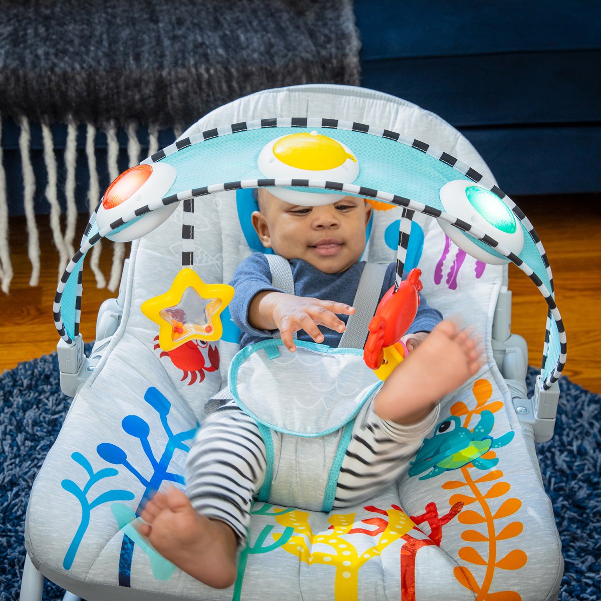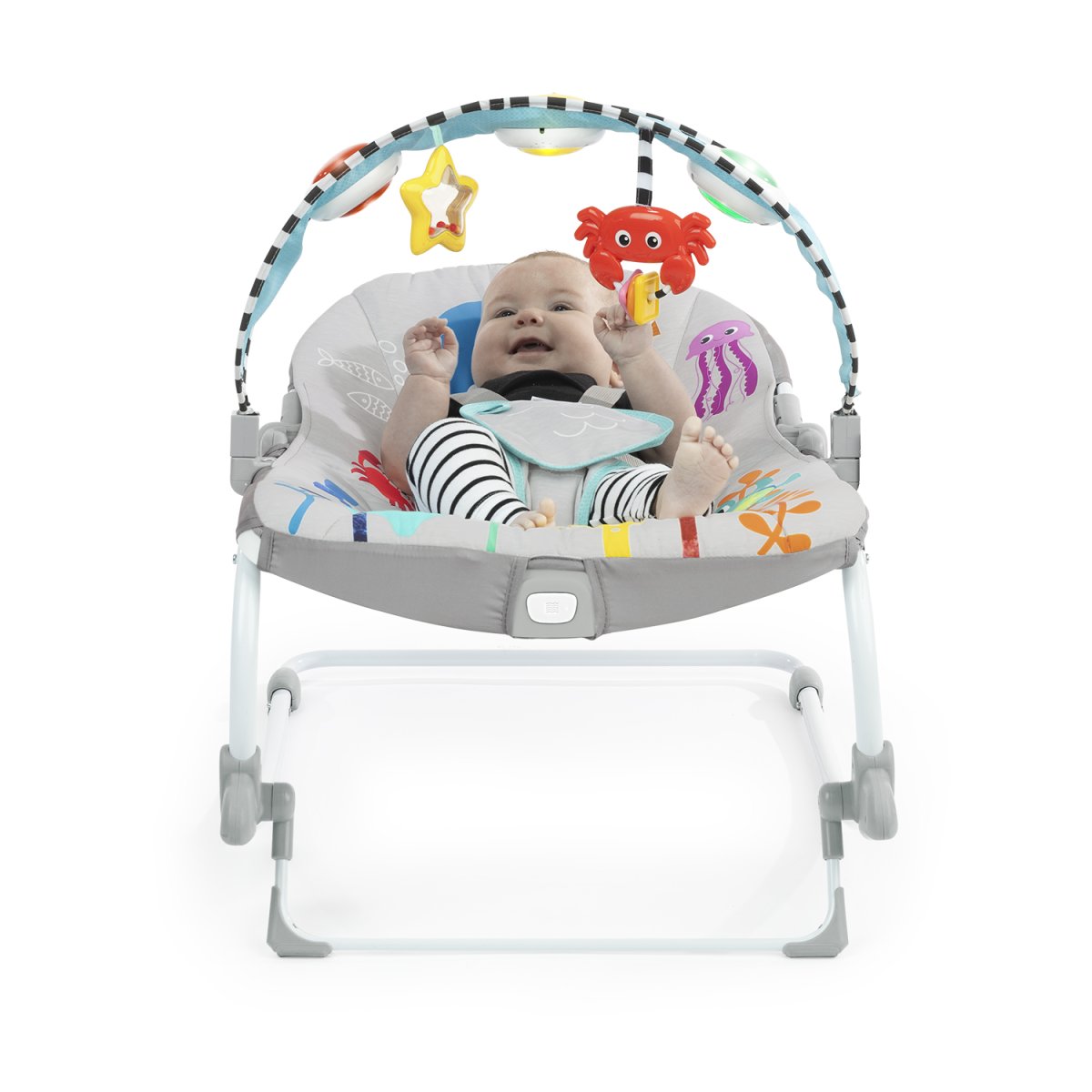 - Fácil de limpiar: La almohadilla del asiento tiene un diseño oceánico y es completamente removible, lo que permite una limpieza sencilla. Tanto la barra de juguetes como el armazón de la mecedora pueden limpiarse fácilmente con un paño húmedo y jabón suave.