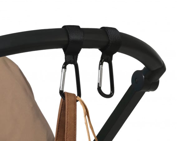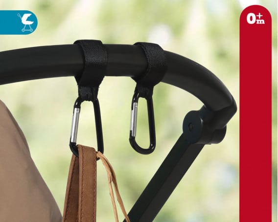 Set de dos mosquetones de tamaño pequeño-medio que se fijan a cualquier manillar de cochecito o silleta mediante velcro y permiten colgar distintos objetos o bolsas fuera del bolso de maternidad.