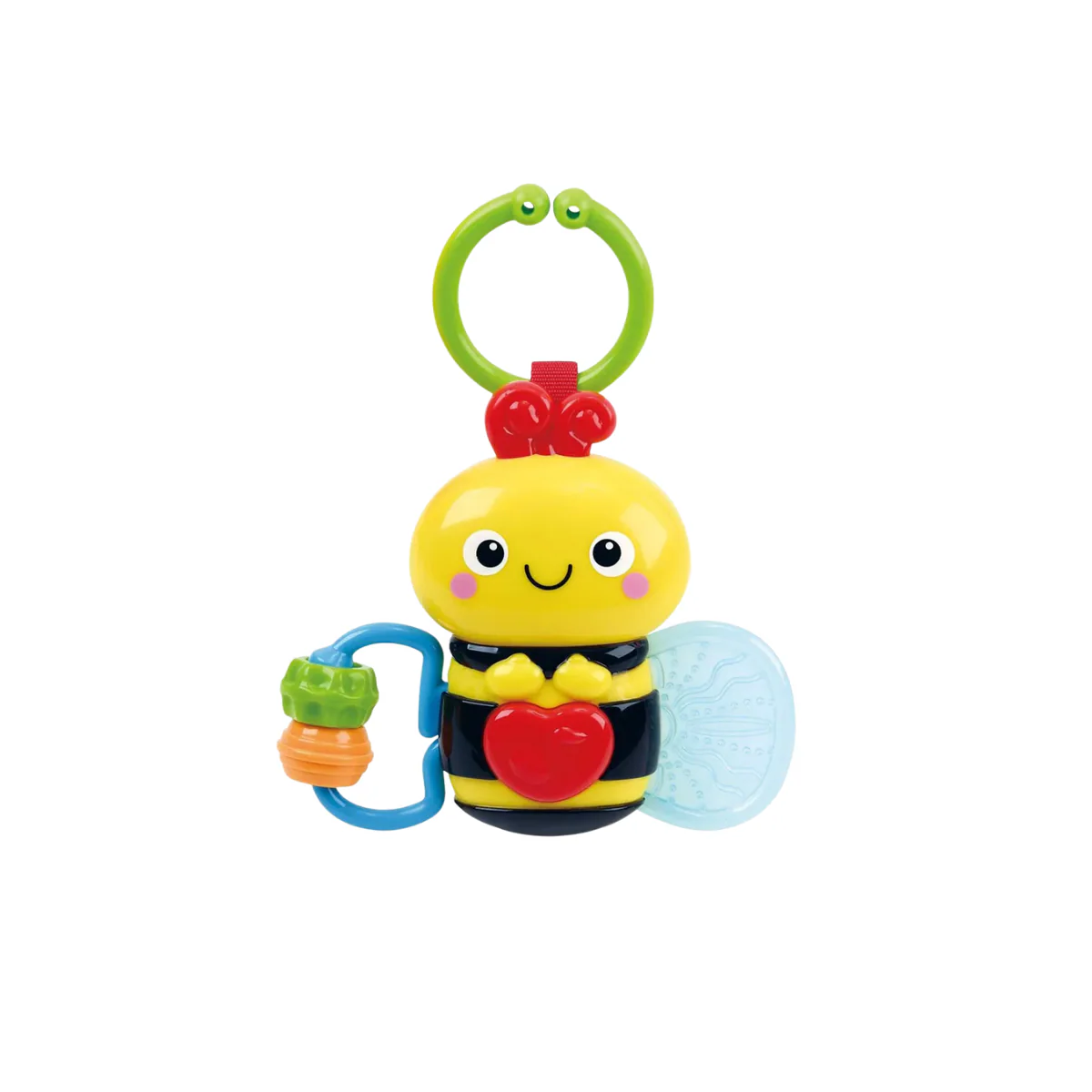Este adorable sonajero con forma de abejita combina colores vibrantes, sonidos suaves y texturas ideales para calmar las encías durante la dentición.